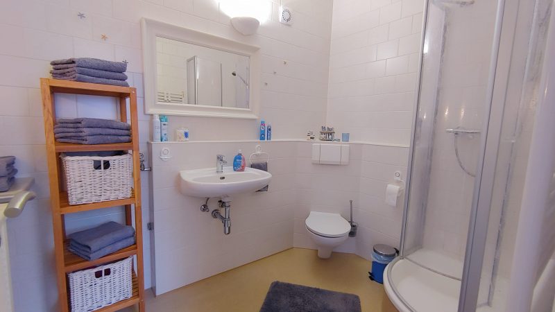 Das Badezimmer verfügt über Dusche, Waschbecken und WC.